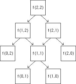 예를 들어 f(2,2)을 계산한다고 해보자. 이 경우 아래 그림과 같은 참조를 거치게 된다.